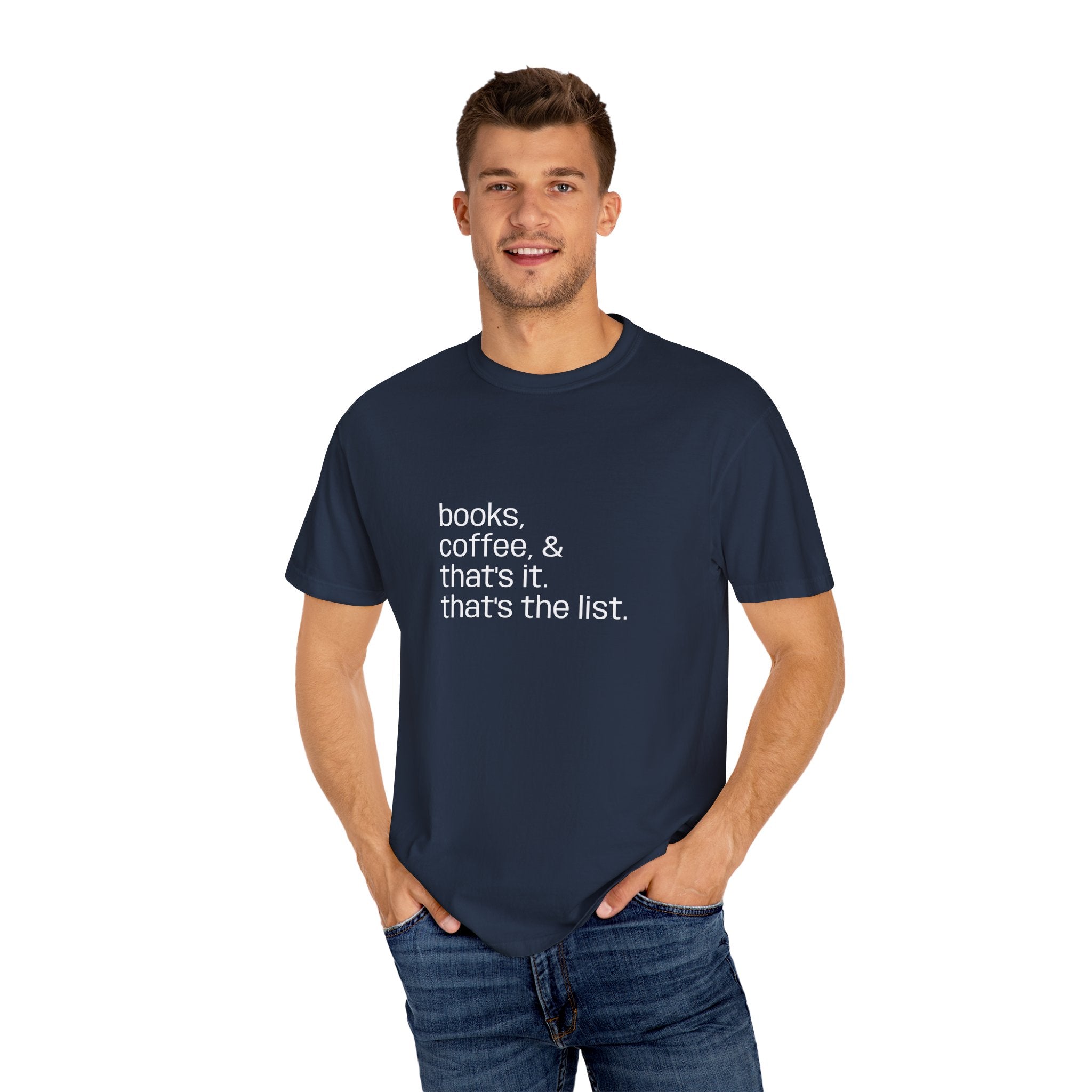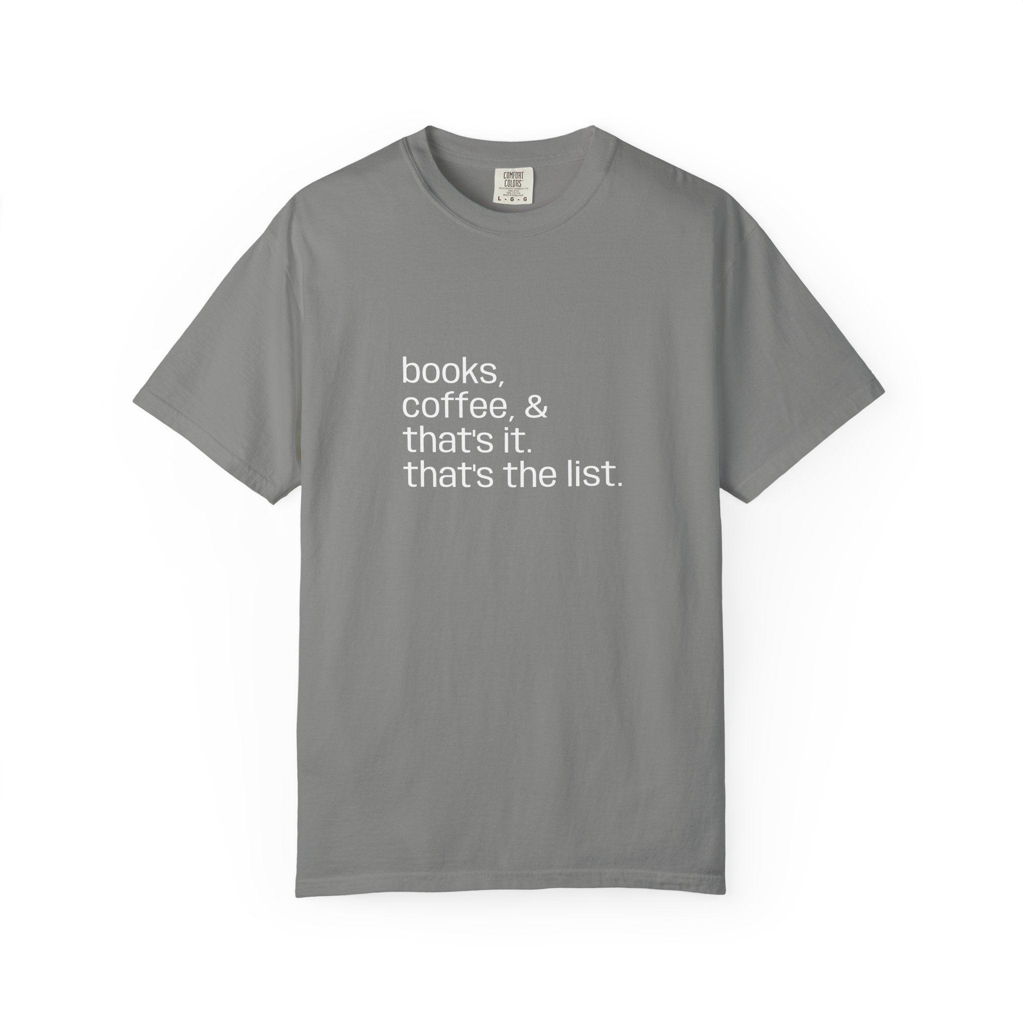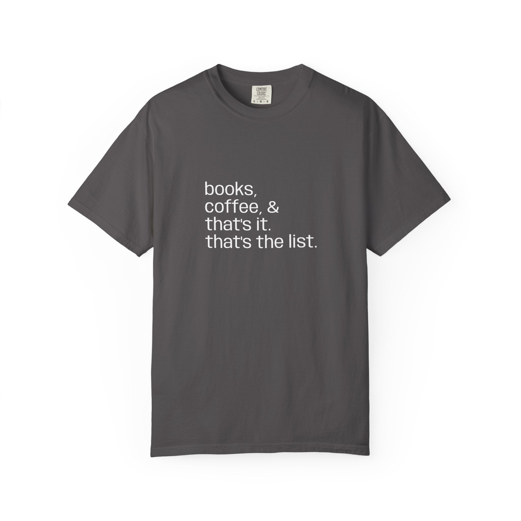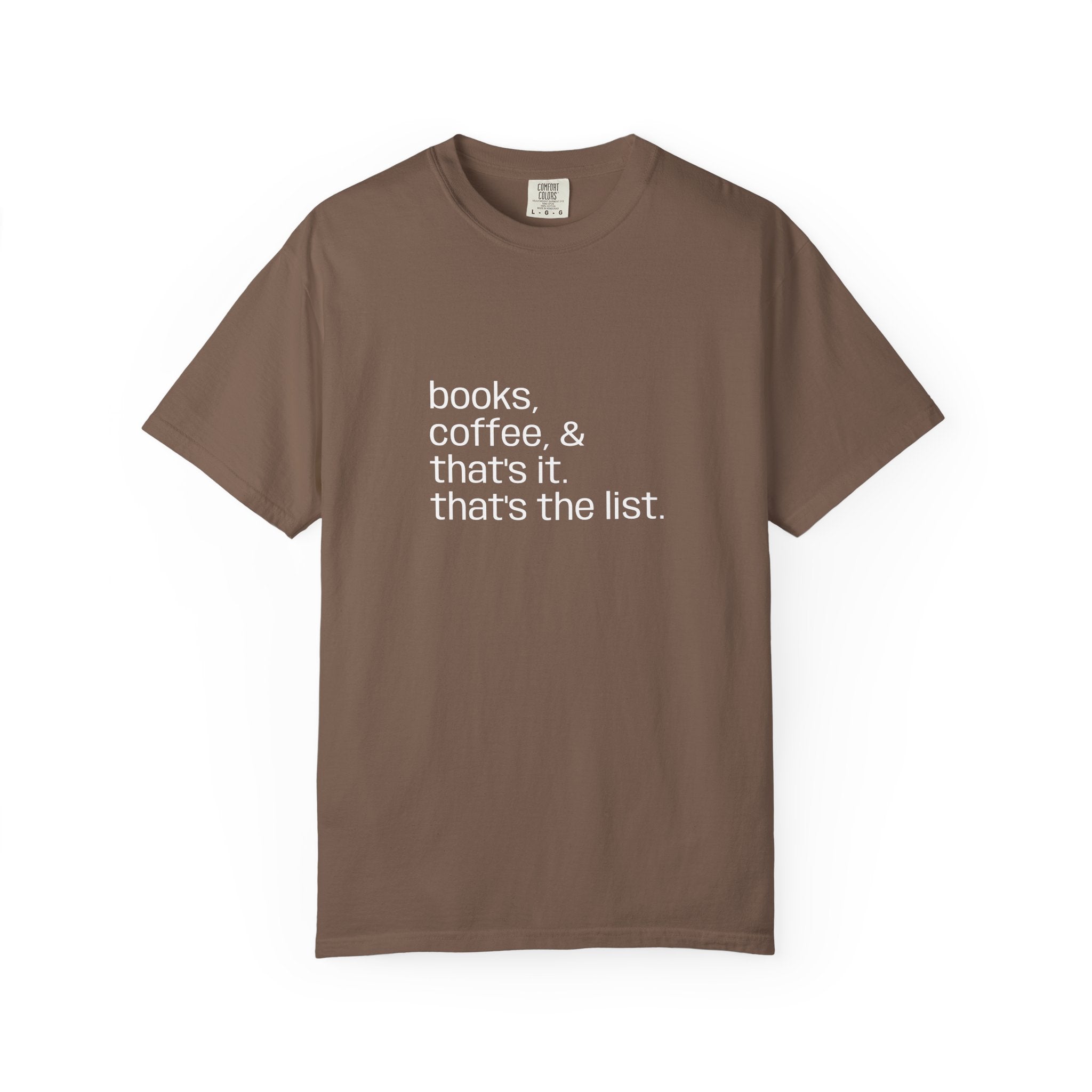Who says a list has to be a mile long? This comfy tshirt lists two perfect ingredients for a relaxing Saturday: books and coffee. This preshrunk, soft-washed tee is 100% ring-spun cotton and brings extra coziness to your wardrobe while the relaxed fit makes it an excellent weekend or